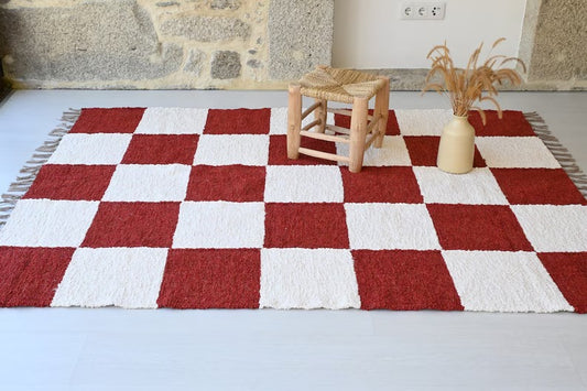 KÄSINKUDOTTU RUUTUMATTO - 140cm x200cm - PUNA-VALKOINEN