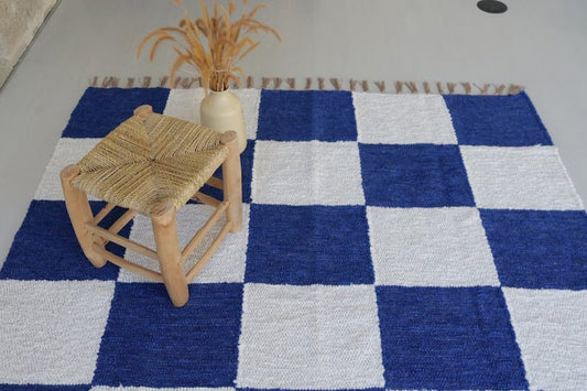 KÄSINKUDOTTU RUUTUMATTO - 140cm x200cm - SINI-VALKOINEN