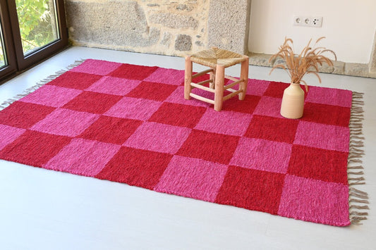 KÄSINKUDOTTU RUUTUMATTO - 150cm x210cm - PINKKI/PUNAINEN